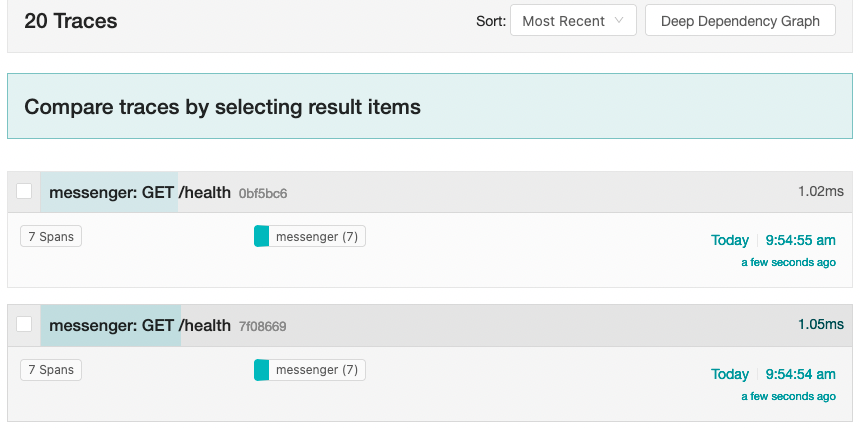Inicie uma segunda sessão de terminal separada. (As instruções subsequentes chamam este de terminal do cliente e o terminal original – usado nas etapas 1 e 3 – de terminal do mensageiro .) Aguarde cerca de dez segundos e envie uma solicitação de verificação de integridade ao serviço de mensagens (você pode executar isso algumas vezes se quiser ver vários rastros):