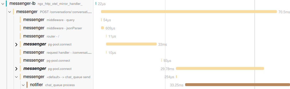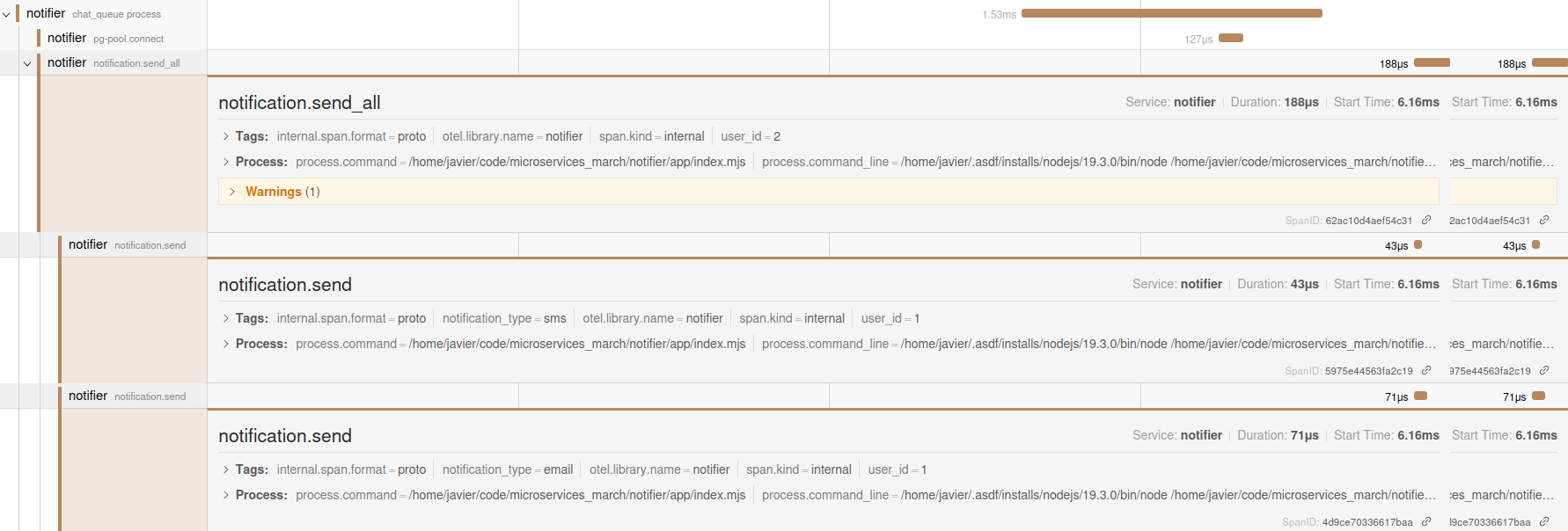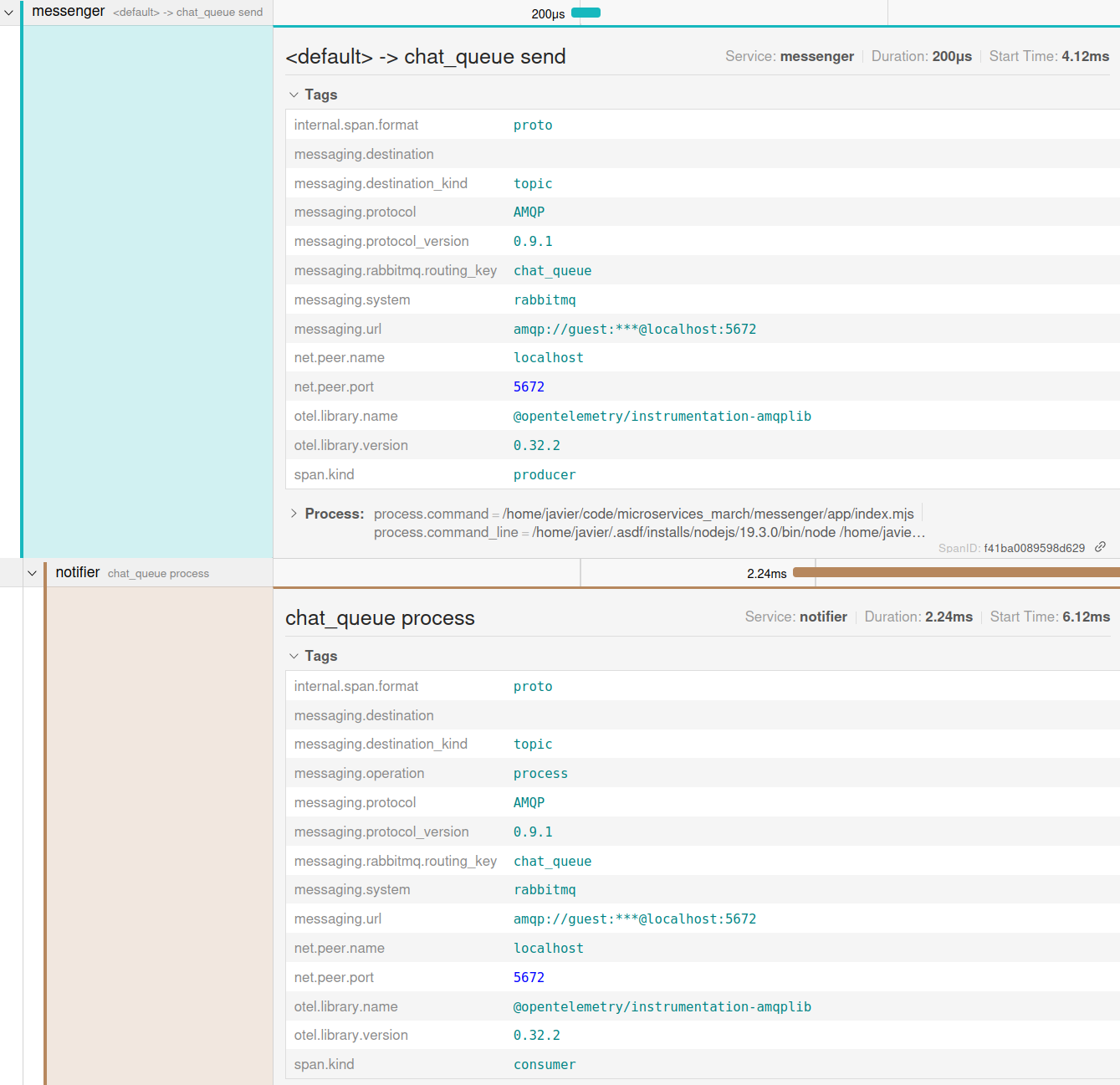 No entanto, você pode ver que um intervalo de processo chat_queue para o serviço notificador começou em 6,12 ms, 2 ms depois que um intervalo de envio chat_queue começou para o serviço de mensagens em 4,12 ms.