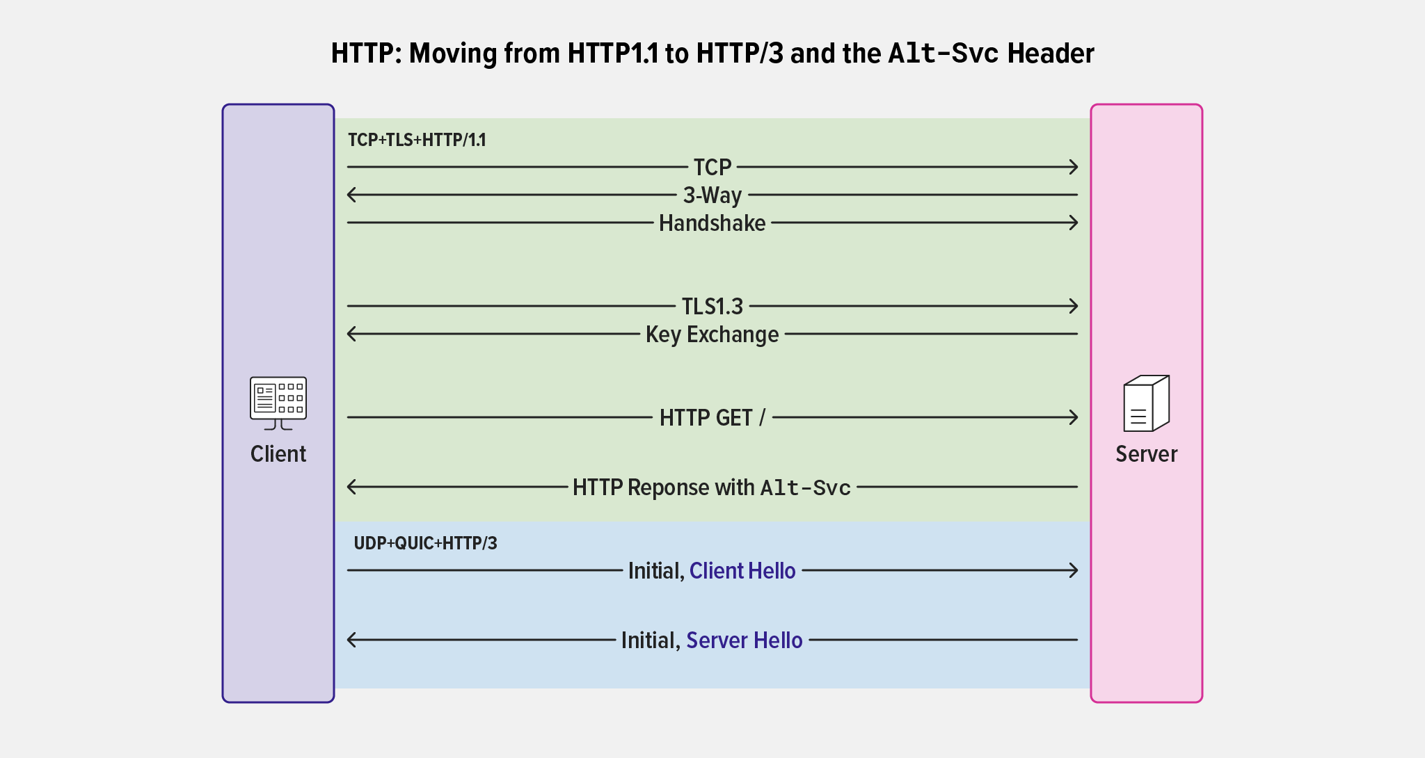 Alt-SvcQuase todos os clientes (navegadores em particular) fazem conexões iniciais via TCP/TLS. Se um servidor suportar QUIC+HTTP/3, ele sinaliza esse fato ao cliente retornando uma resposta HTTP/1.1 que inclui o parâmetro h3 no cabeçalho Alt-Svc . O cliente então escolhe se deseja usar QUIC+HTTP/3 ou manter uma versão anterior do HTTP. (A título de curiosidade, o cabeçalho Alt-Svc , definido no RFC 7838 , é anterior ao QUIC e pode ser usado para outros propósitos também.)
