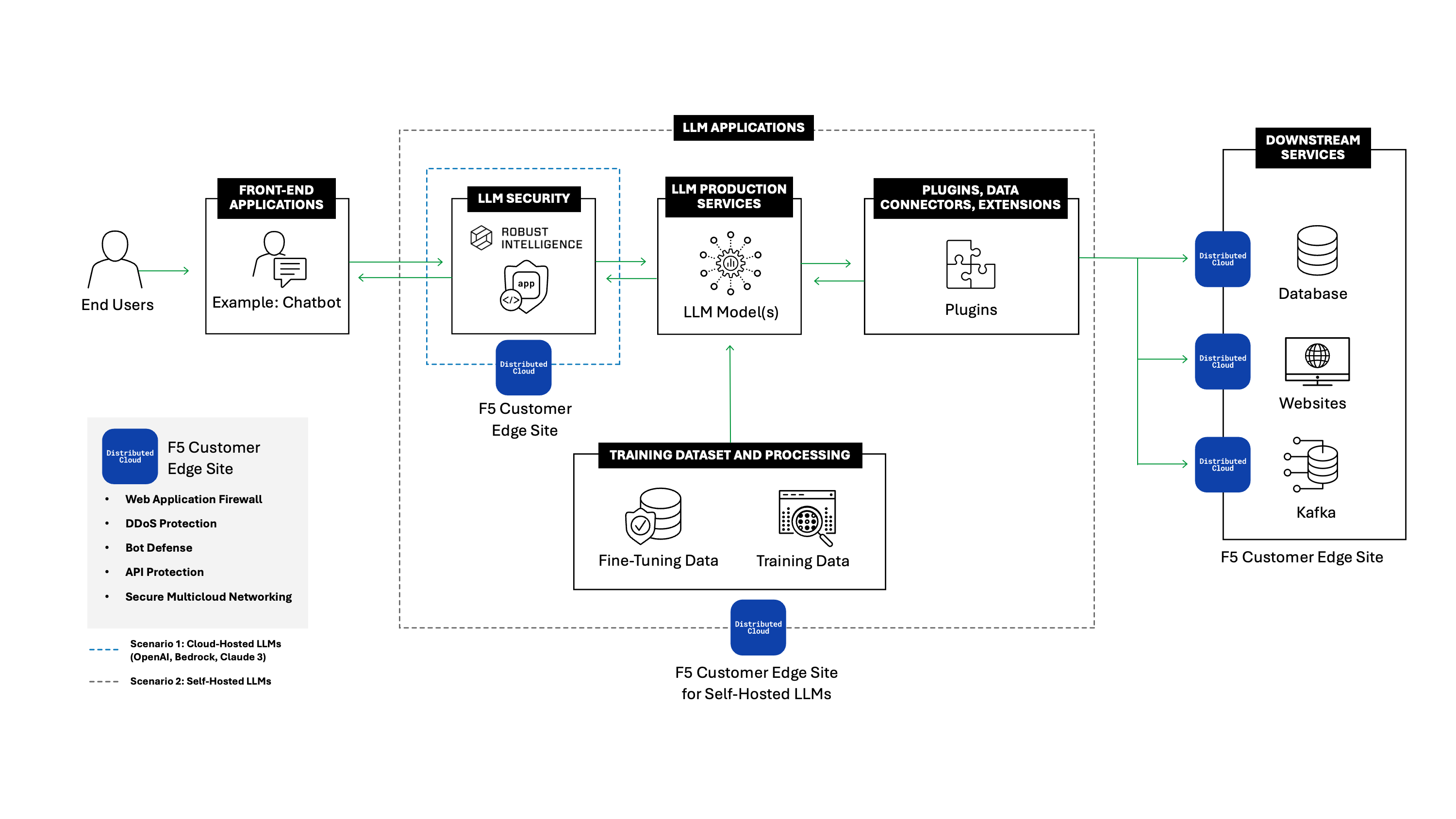 A integração do Firewall de IA da Robust Intelligence ao ecossistema de Serviços de Nuvem Distribuída da F5 fortalece ainda mais essa postura de segurança e fornece cobertura em tempo real para aplicativos empresariais de IA. O Firewall de IA examina as entradas e saídas de aplicativos de IA instantaneamente para determinar a legitimidade das interações. Ele identifica e bloqueia ameaças potenciais, garantindo que os modelos de IA operem dentro de parâmetros seguros e não sejam manipulados por agentes mal-intencionados.